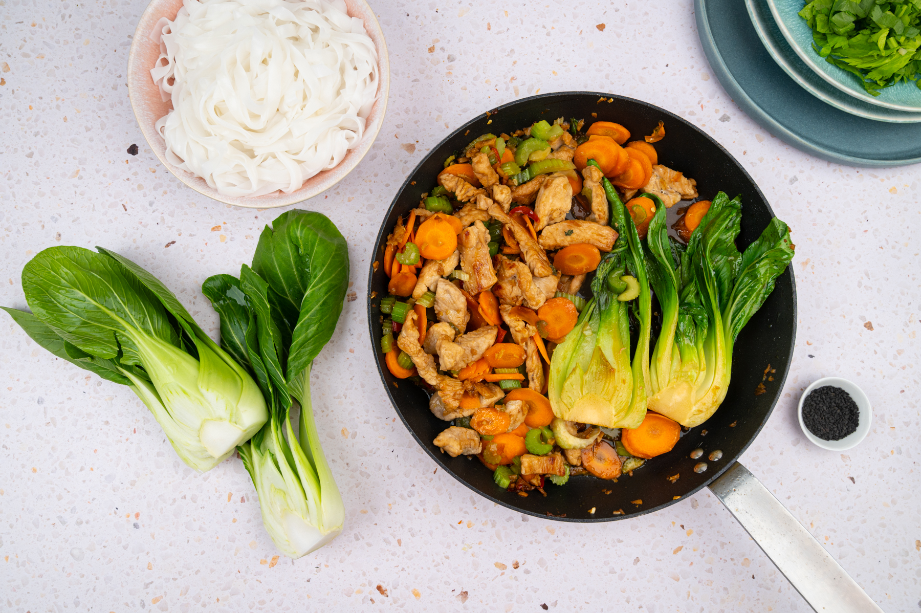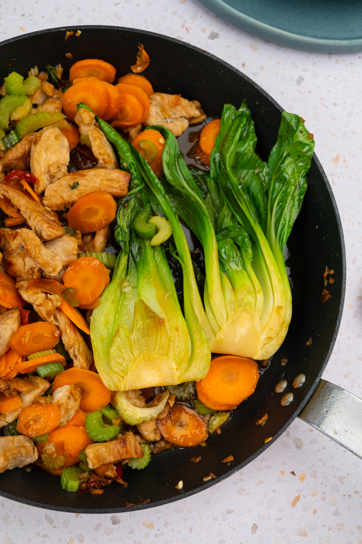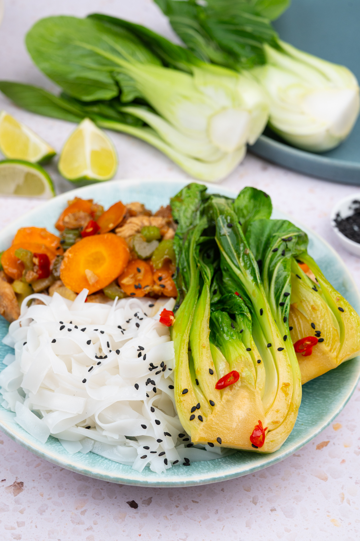 Asiatisch inspirierte Gemüsepfanne mit Möhre, Staudensellerie & Pak Choi