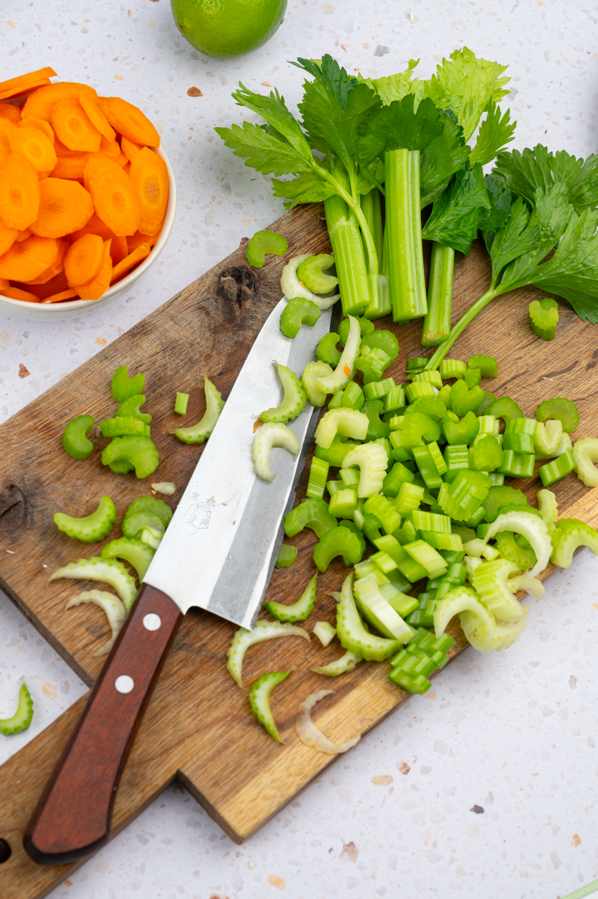 - Sellerie putzen, waschen und in etwa 0,5 cm breite Streifen schneiden.