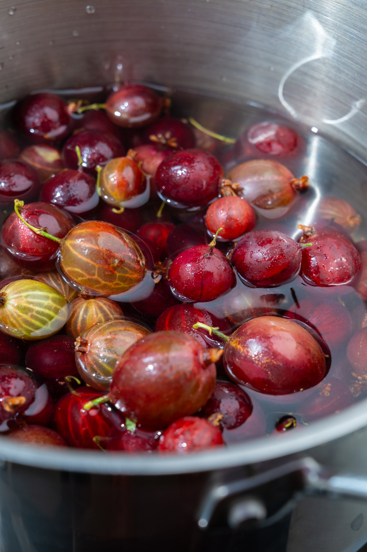 - Stachelbeeren waschen und in einem Topf mit 300 ml Wasser aufkochen. Etwa 5 Minuten köcheln lassen, bis die Beeren weich sind.
